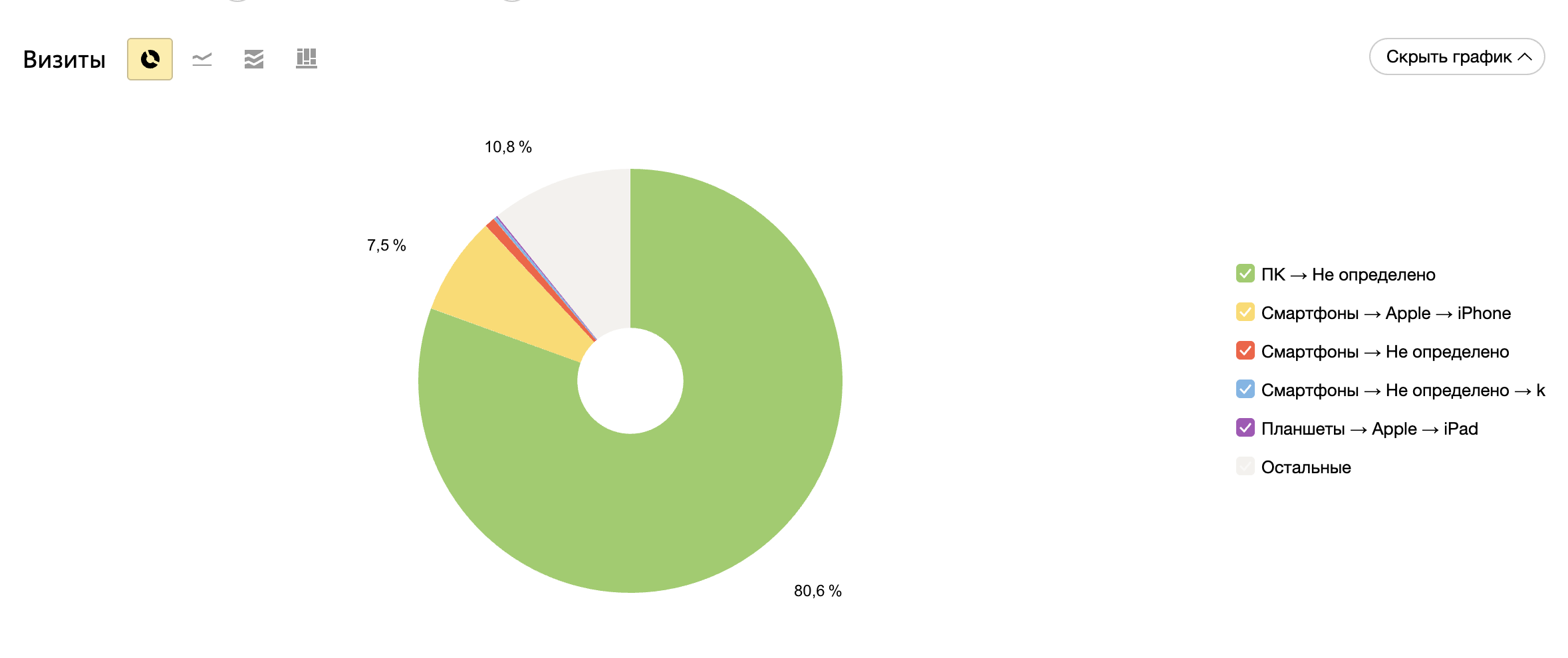 Статистика по моделям устройств, которые используют посетители: компьютер, смартфоны, планшеты или SmartTV.
