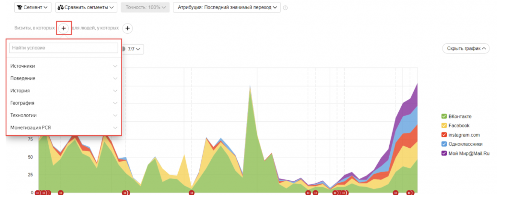 Давайте для примера создадим отчёт в Яндекс.Метрике, где выведем график пользователей, которые перешли к нам из соцсетей и смотрят сайт с iPhone.